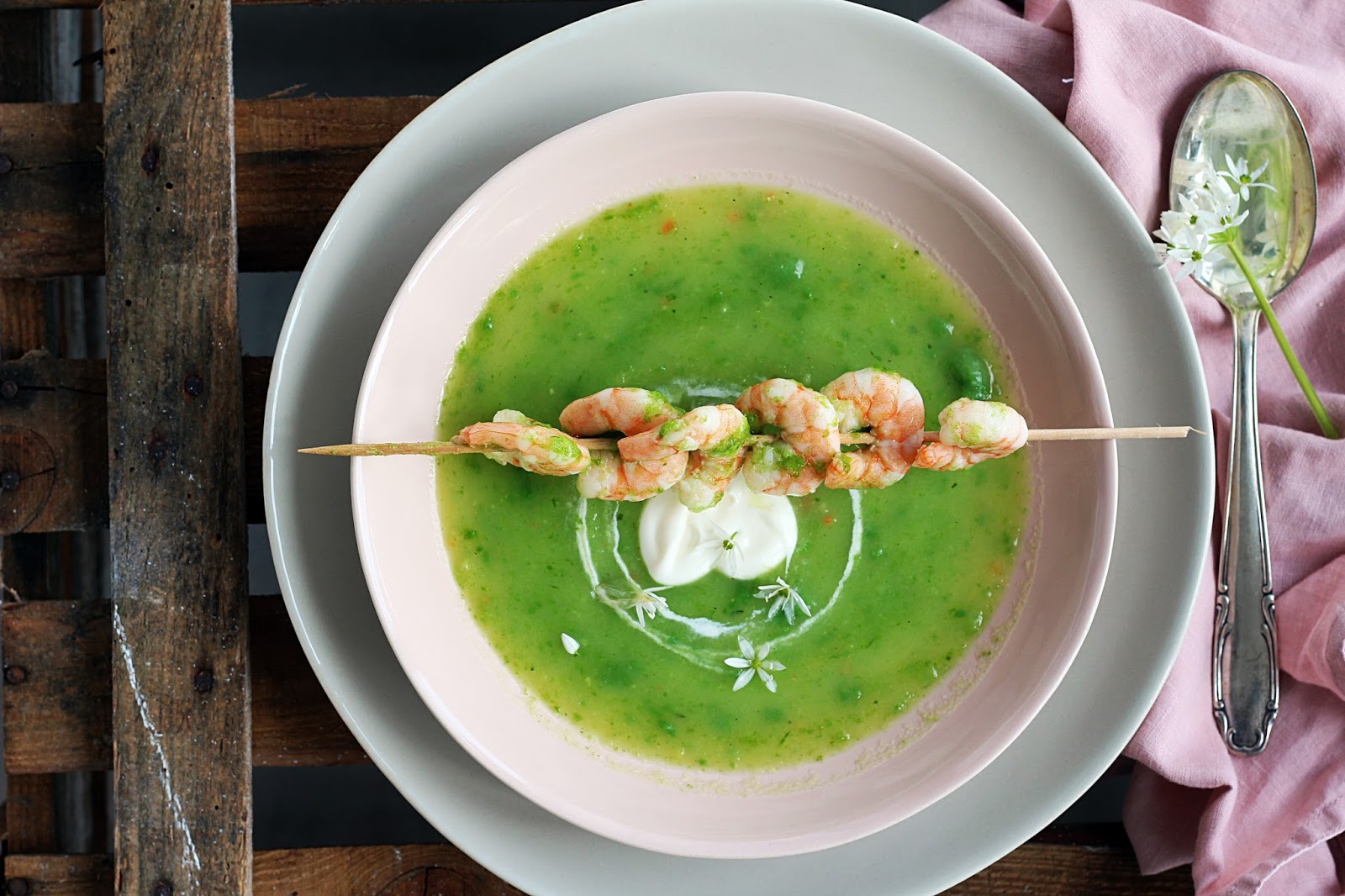 geben und jeweils 5 – 6 Garnelen aufspießen und quer über den Teller legen. Eventuell Blüten garnieren.
