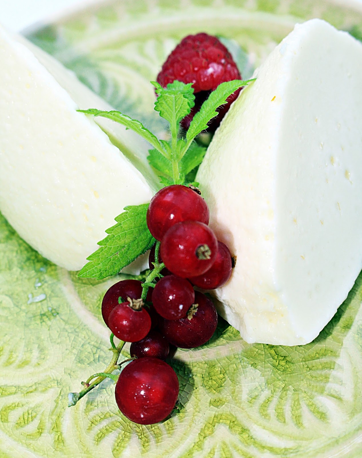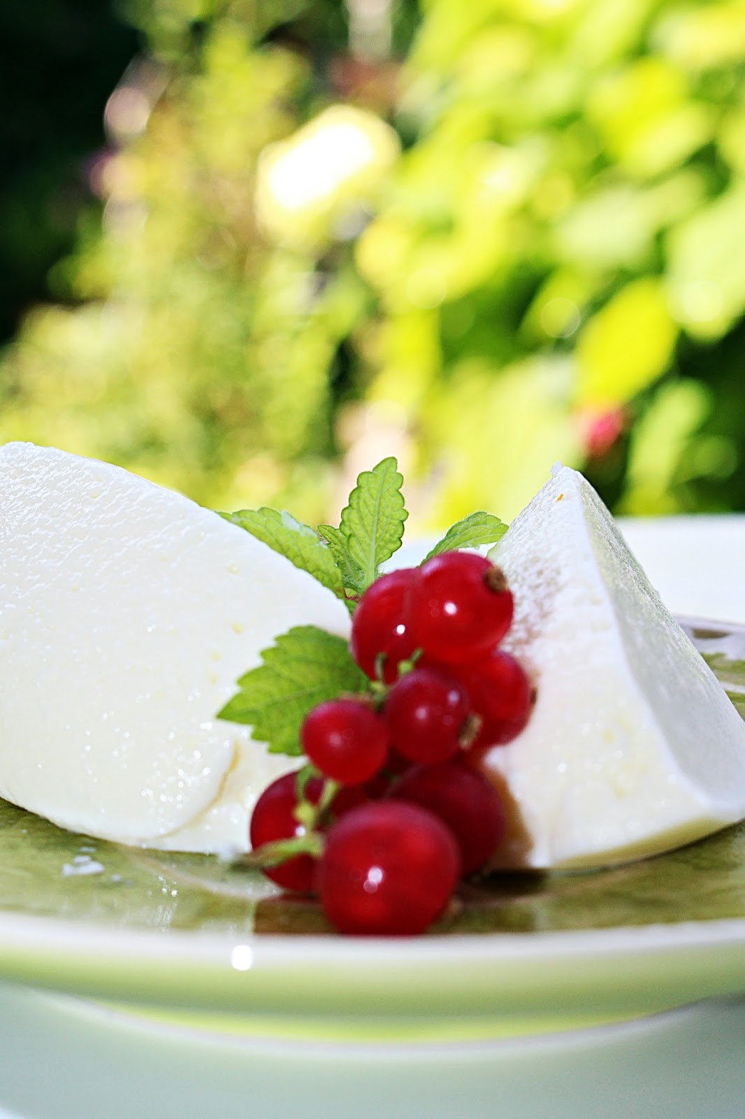 Nach dem Abkühlen mit Zitronenmelisse und Beeren garnieren. Es sieht auch schön aus wenn man kleine Nocken absticht und diese auf einem Teller anrichtet.