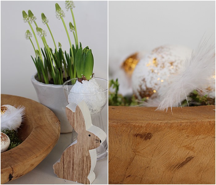 Die Eier habe ich in eine rustikale Holzschale gelegt. Mir gefällt die Kombination aus den zarten Eiern und dem doch rustikalen Holz sehr gut.