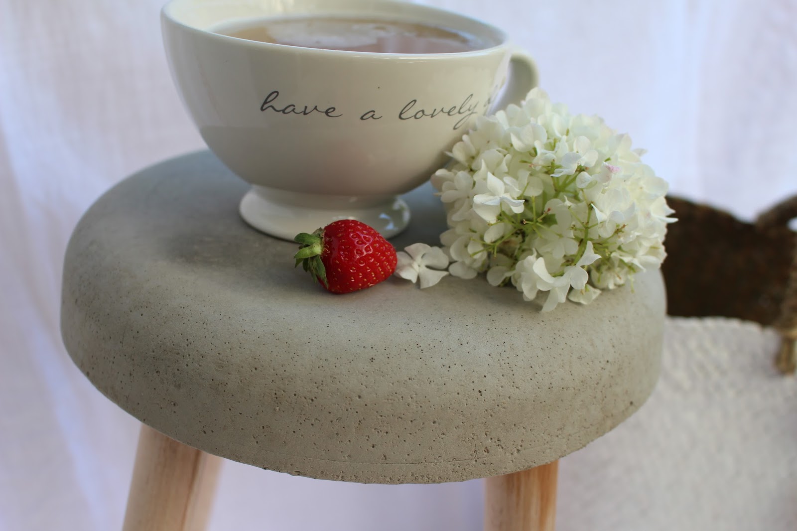 So jetzt lasse ich mir mein Erdbeertörtchen auf meinem neuen Hocker in der Sonne schmecken.