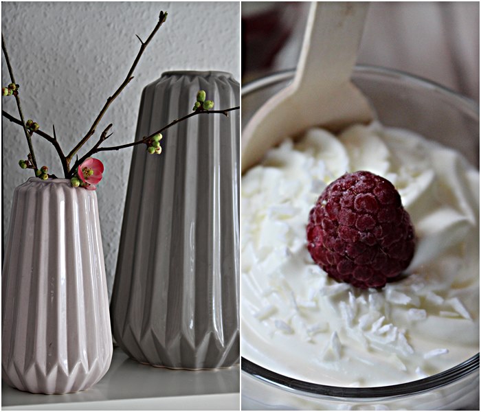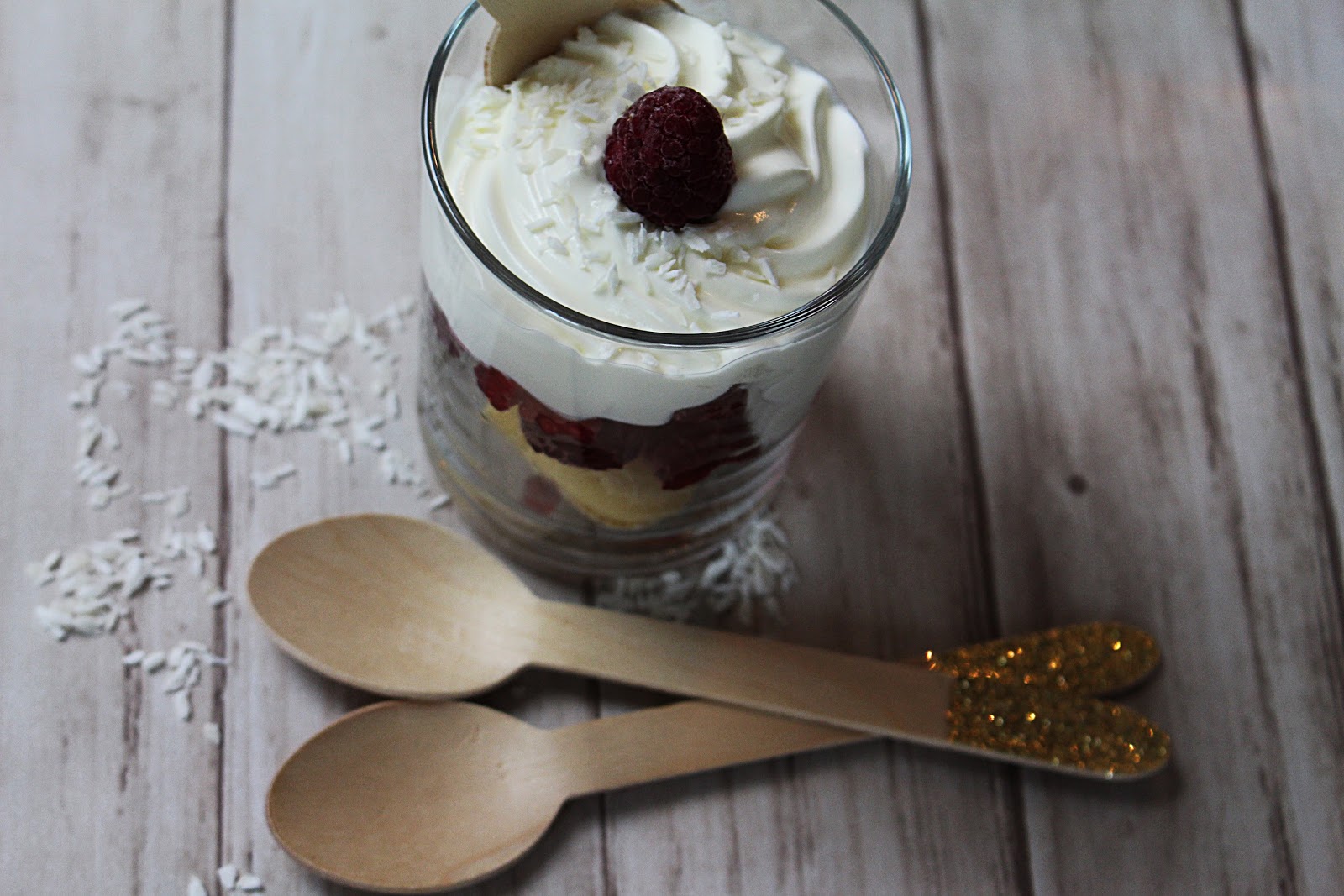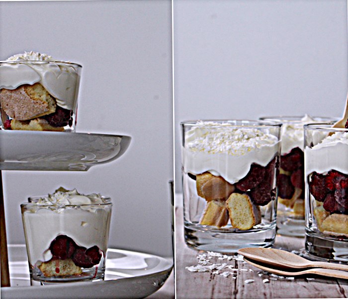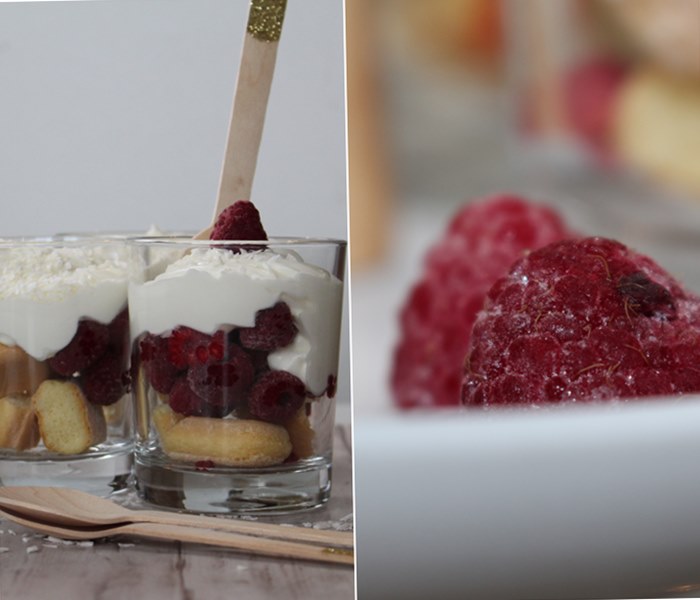 Jetzt die Creme auf die Himbeeren geben und mit den Kokosflocken verzieren.