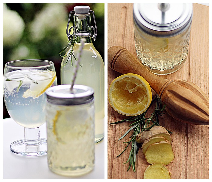 Den Zitronensaft, Wasser, Ingwer und Rosmarin bei mittlerer Hitze aufkochen und etwa 3 Stunden ziehen lassen. Abseihen. Dann den Sud mit einem Liter Wasser und dem Zucker aufkochen lassen. Jetzt alles durch ein feines Sieb zuerst in einen anderen Topf gießen und zum Haltbar machen ein weiteres Mal aufkochen.