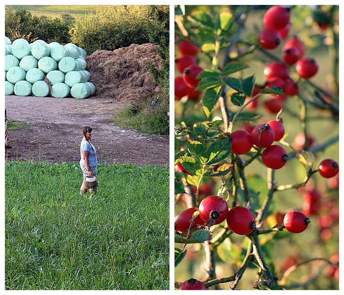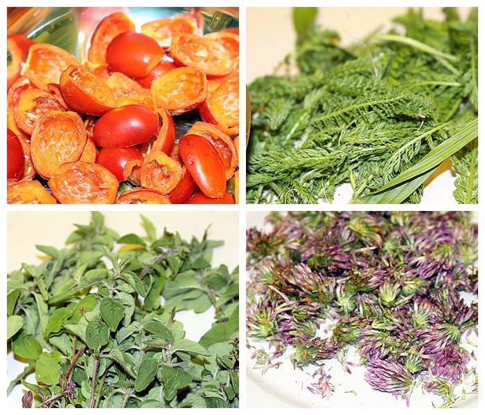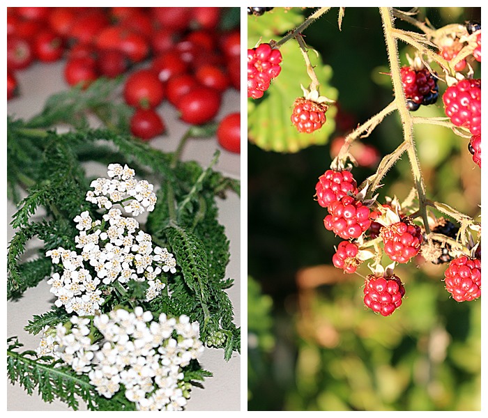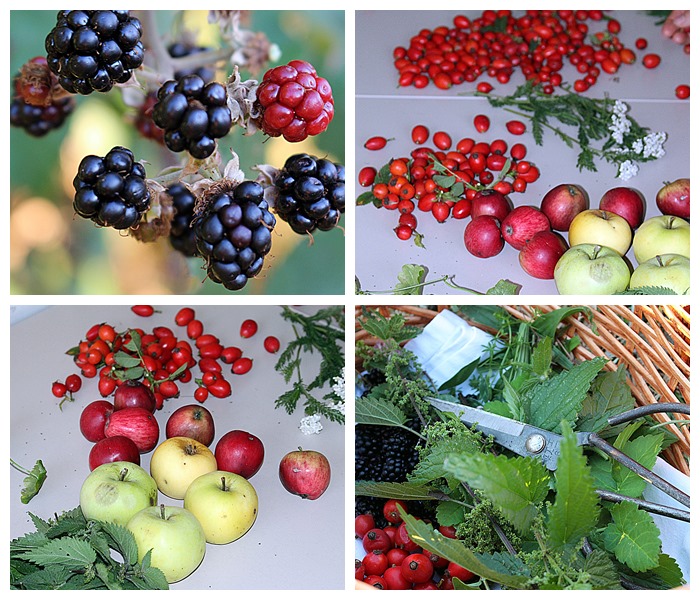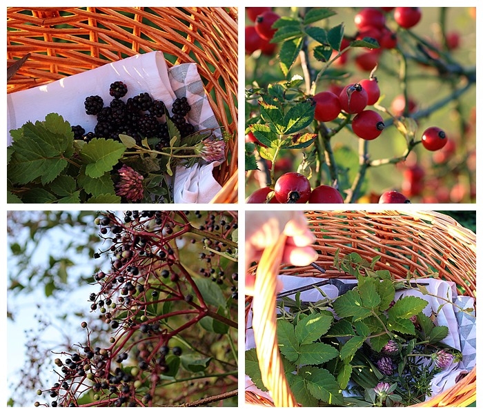 Brennnessel-spitzen und – Samen, Giersch, Hagebutten, Holunderbeeren, Brombeeren, Feld-Thymian (Quendel), Franzosenkraut, Wilder Majoran (Dost) und Gundermann. Wahrscheinlich habe ich aber das eine oder andere Kraut in meiner Aufzählung vergessen. Ach ja, ein paar Äpfel landeten auch noch in den Körben.