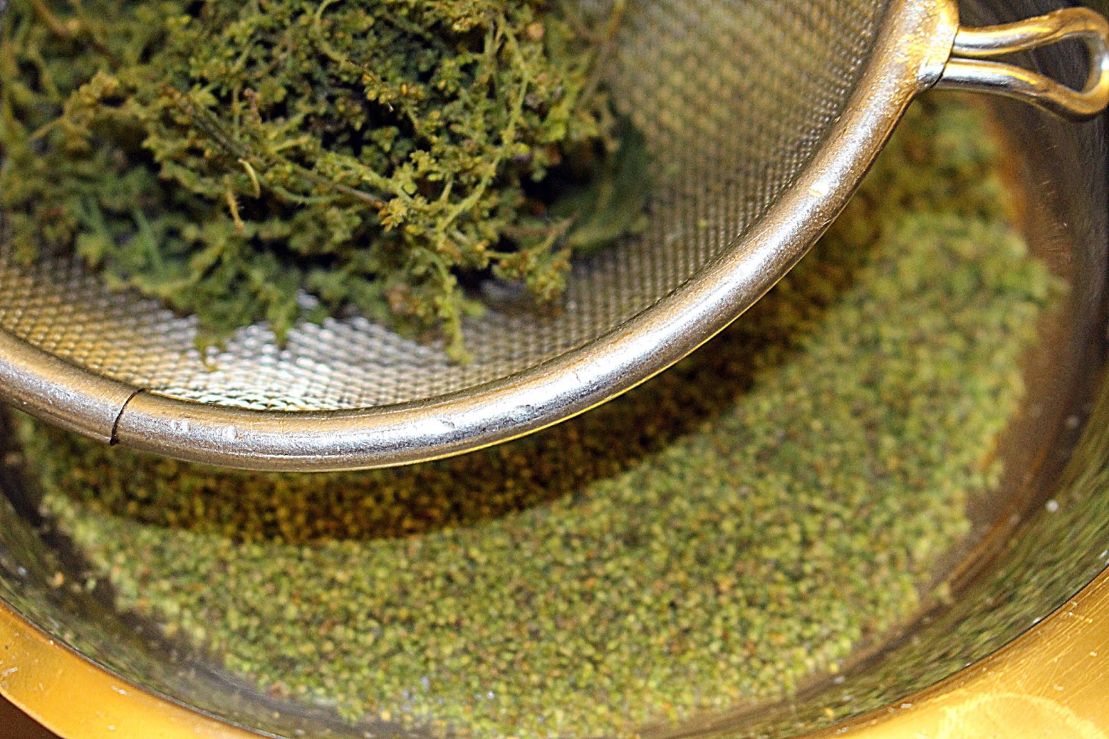 Die Brennesseln werden mitsamt der „Sahmenwürstchen“ in ein Sieb gelegt, dann muss man nur noch gut schütteln und die Samen in einem Schüsselchen auffangen.