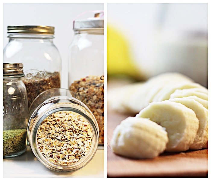 Kokoschips, Chiasamen und Gewüze. Süßschnäbel verfeinern das Ganze noch mit, Honig, Sirup oder Agavendicksaft.