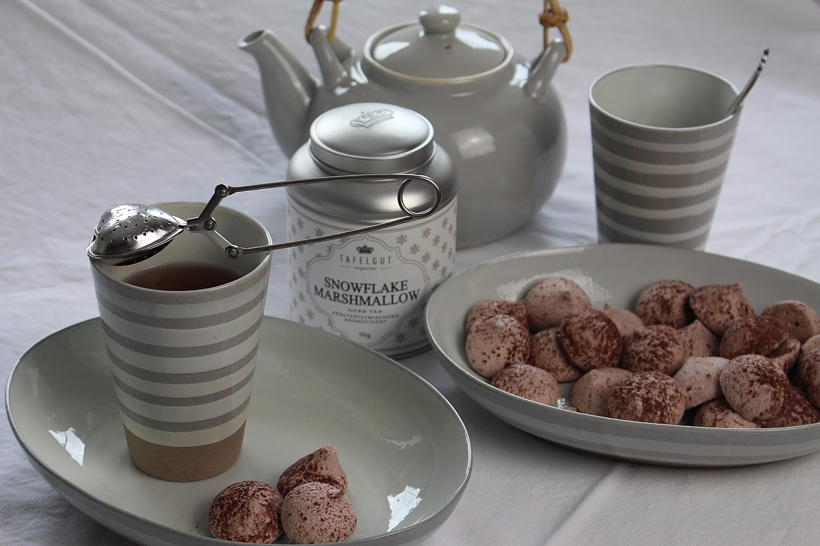 Damit der Tee nicht ganz so „trocken“ daher kommt habe ich vegane Meringues/Baiser dazu gebacken.