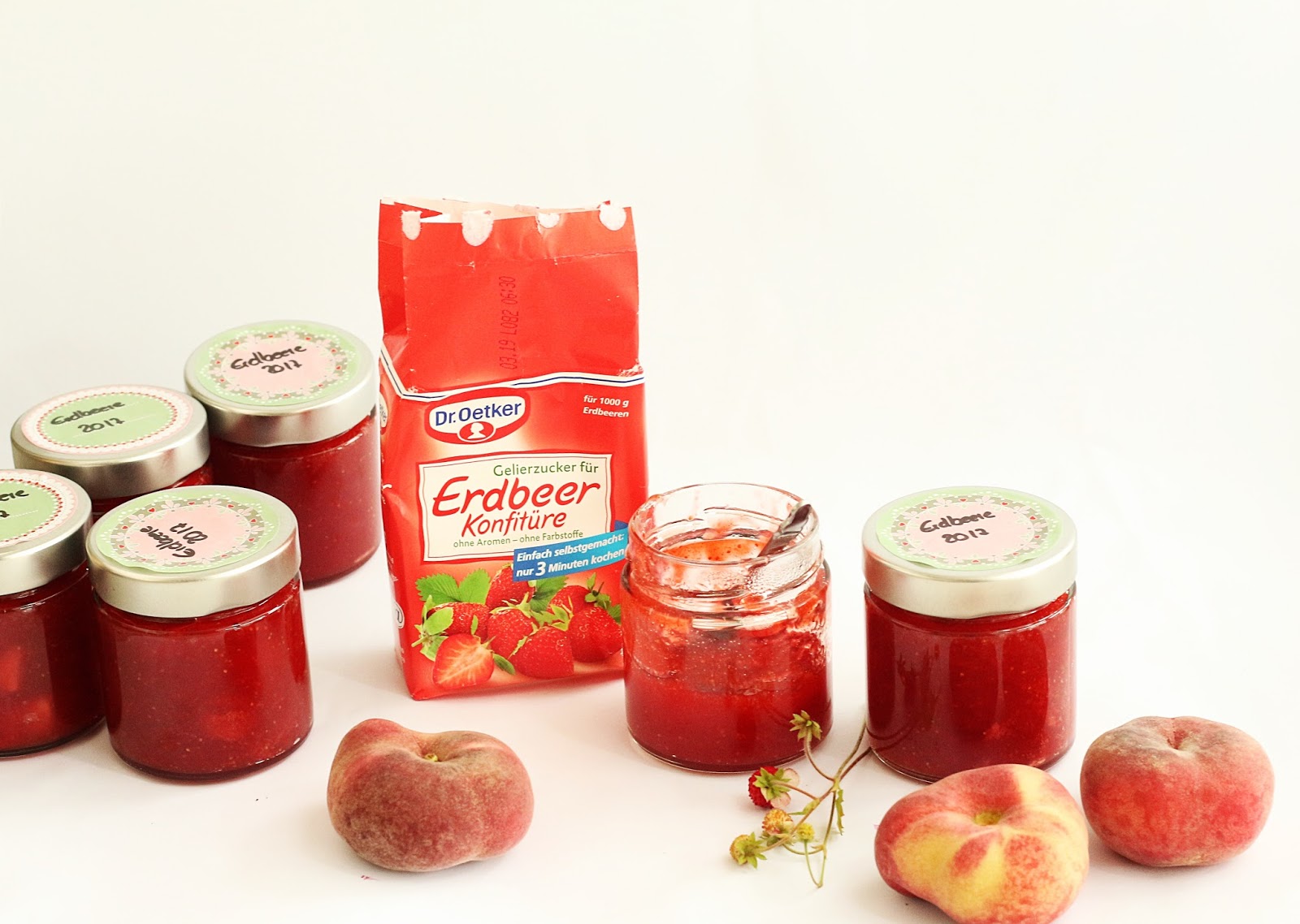 Die Erdbeer-Pfirsich Konfitüre habe ich mit dem Starter-Einmach-Set von Dr. Oetker Deutschland** gemacht. Das Set beinhaltet alles was man zum Marmeladekochen benötigt ♥