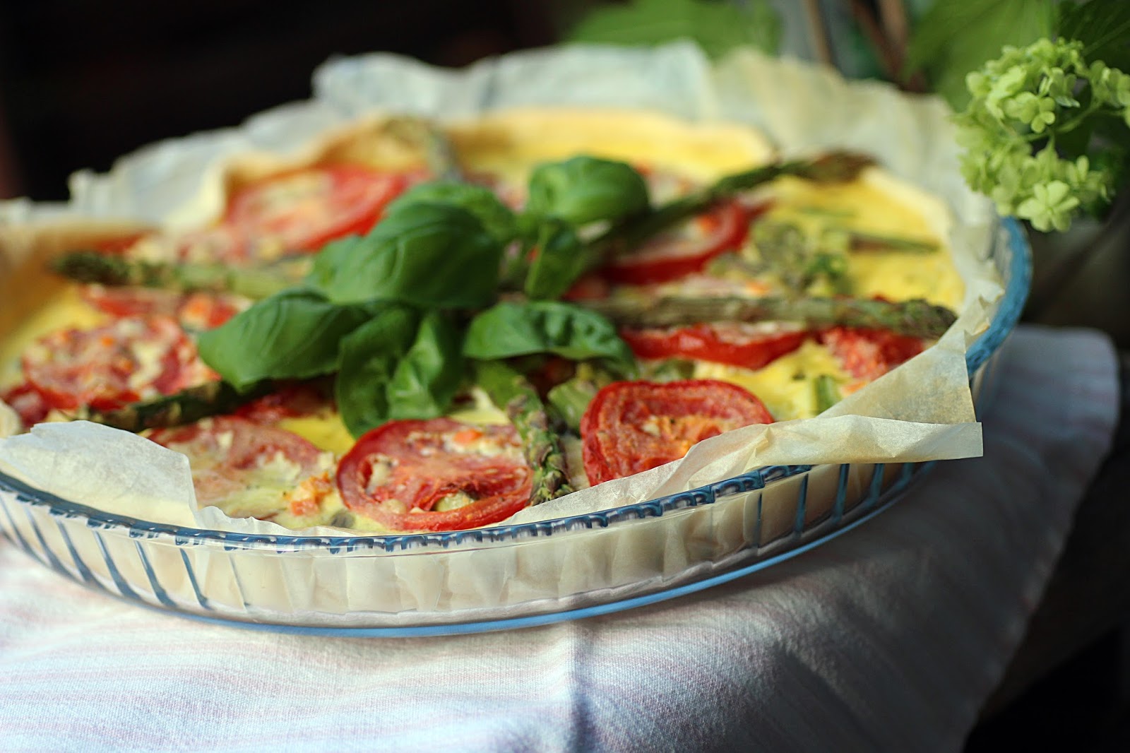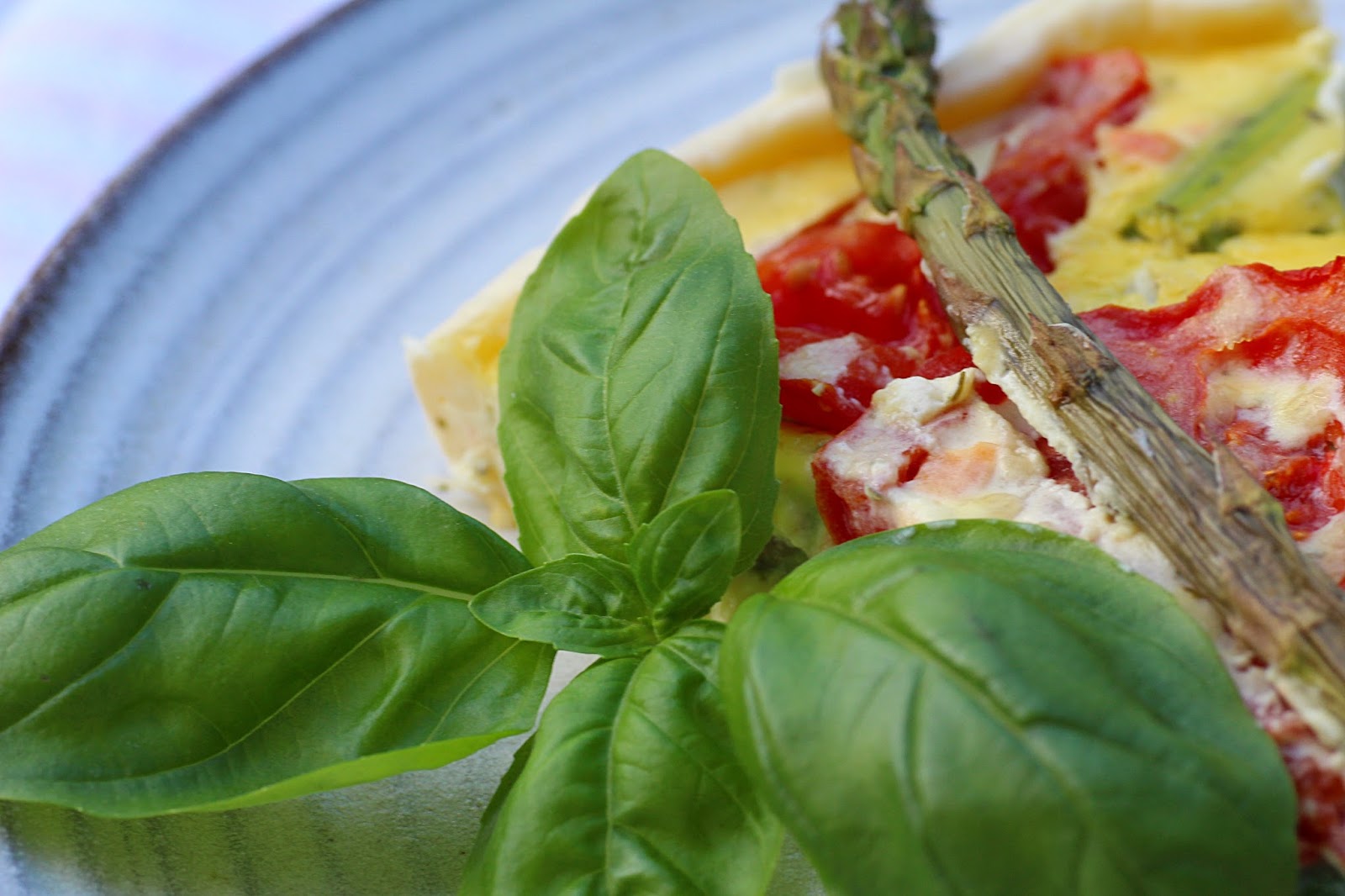 es heute eine Quiche mit grünem Spargel und Tomaten bei uns. Da die Spargelzeit nun bald vorbei ist musste es eine Kombination aus Beidem sein 🙂