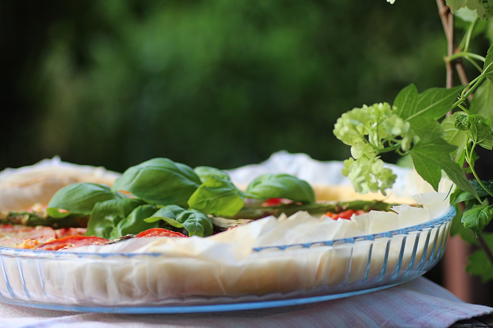 auf dem Teigboden verteilen, Spargel und Tomaten blütenförmig darauf